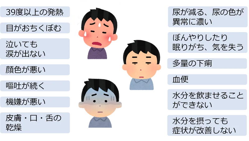 脱水症状が起こりやすい季節は一年のうちに夏と冬の2回あります。冬の脱水というと意外に思われる方もいるかもしれませんが、湿度が低く乾燥する冬場は皮膚からの水分蒸発が発生しやすく、子どもの脱水症状は1~2月が最も多いという報告もあります。併せて、風邪やインフルエンザによる発熱・嘔吐・下痢といった症状による脱水にも気をつけなければならないため、風邪やインフルエンザが流行する冬場も脱水に注意が必要です。