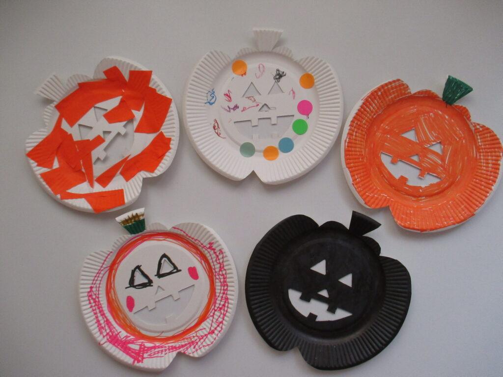 紙皿で作ったジャックオーランタンは、折り紙を切ってのりで貼ったり、ペンで丁寧に色づけしてくれたりしました。