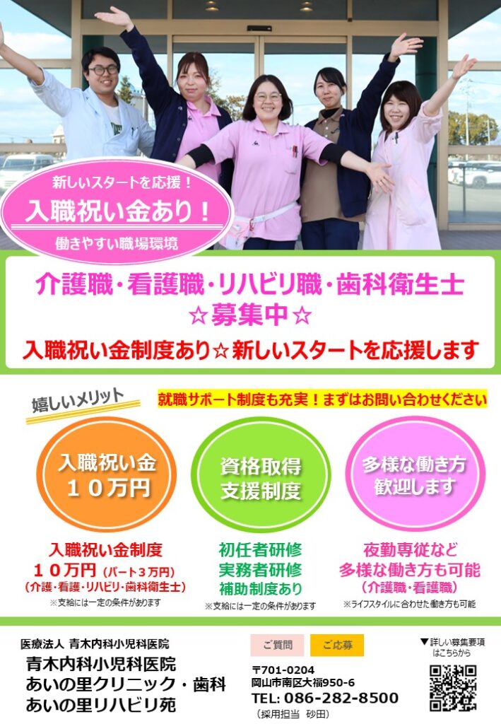 岡山市南区・「あいの里クリニック(歯科)」、介護老人保健施設「あいの里リハビリ苑」では、歯科衛生士・介護職・看護職を募集中です。