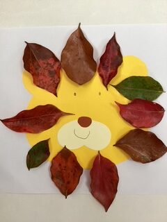 落ち葉を1枚1枚丁寧に貼り、ライオン・ハリネズミ・みのむしに変身!動物たちの表情もかわいらしく描けています♪