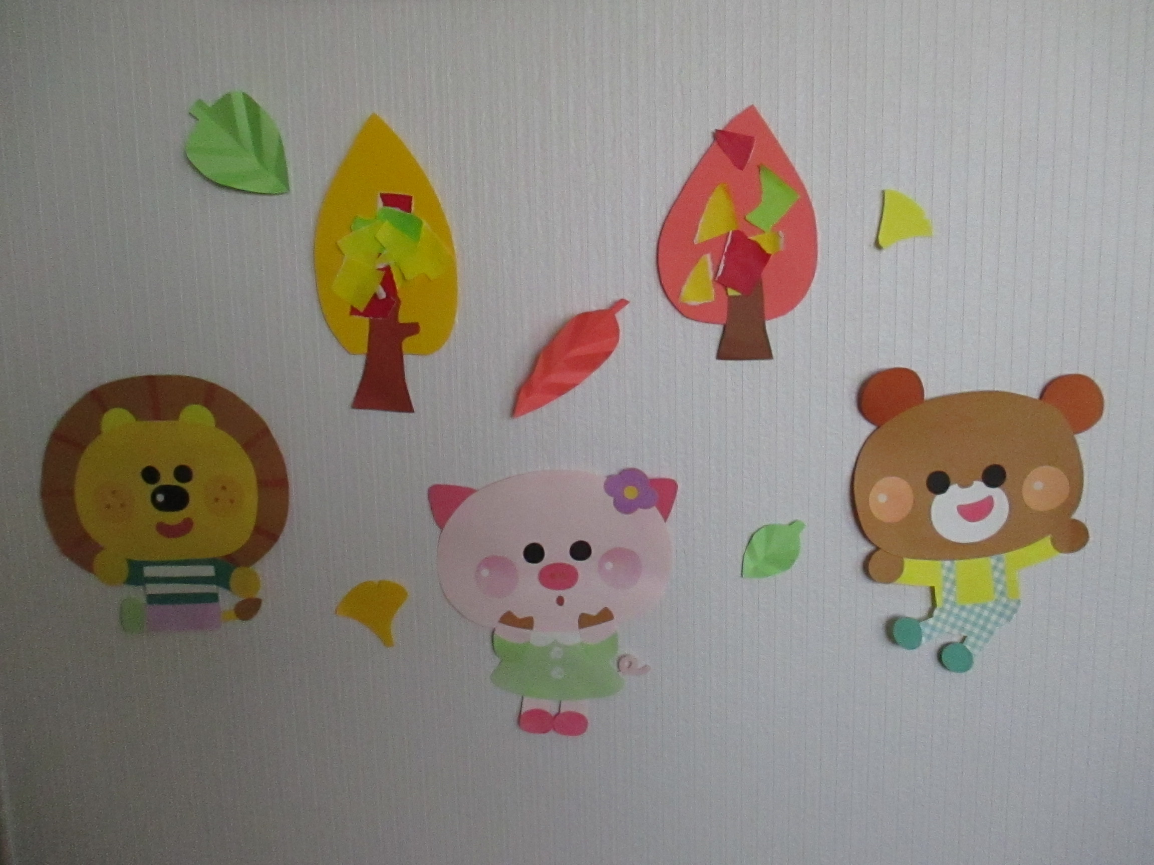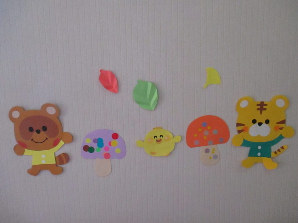 木は、なぐり描きや折り紙を貼って紅葉となり、きのこはシール貼りをして壁面や廊下に秋の色どりを加えてくれます。