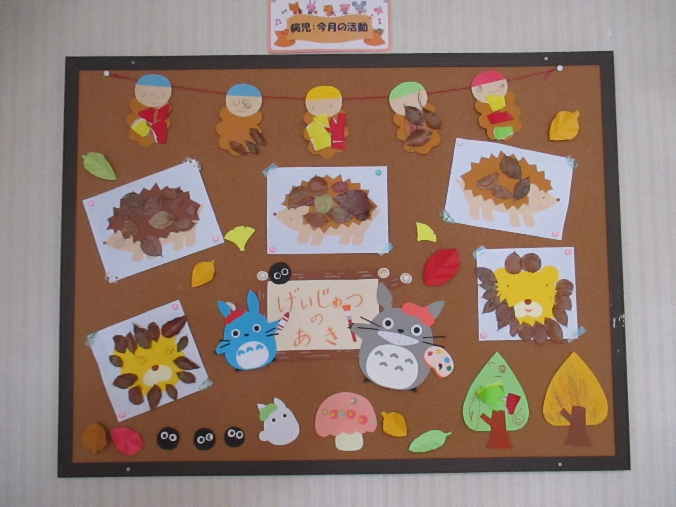 病児保育室でも落ち葉を使った製作遊びをしてみました。子ども達も秋ならではの素材に触れ、季節感を感じながらもいろいろな動物たちを作ります。